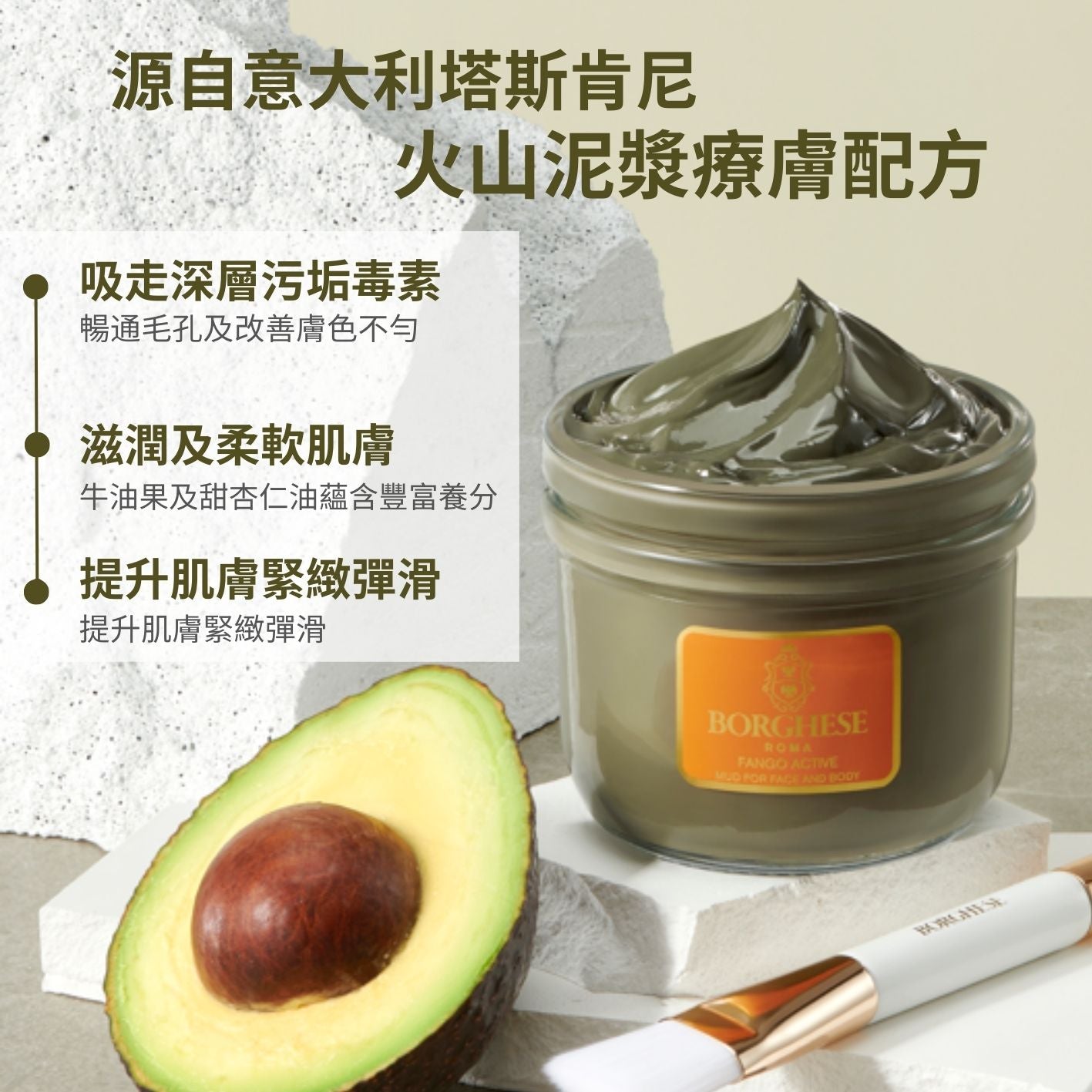 源自意大利塔斯肯尼火山泥漿,匯萃多種天然精萃研製而成,有助排走多餘雜質毒素。蘊含牛油果、甜杏仁油及多種礦物修護成分,可補充及鎖緊水分,幫助活性成份滲透,增加細胞能量,令疲勞暗啞的肌膚重現淨白光澤,令退走失去活力的粗糙膚質,重現幼滑細嫩觸感。